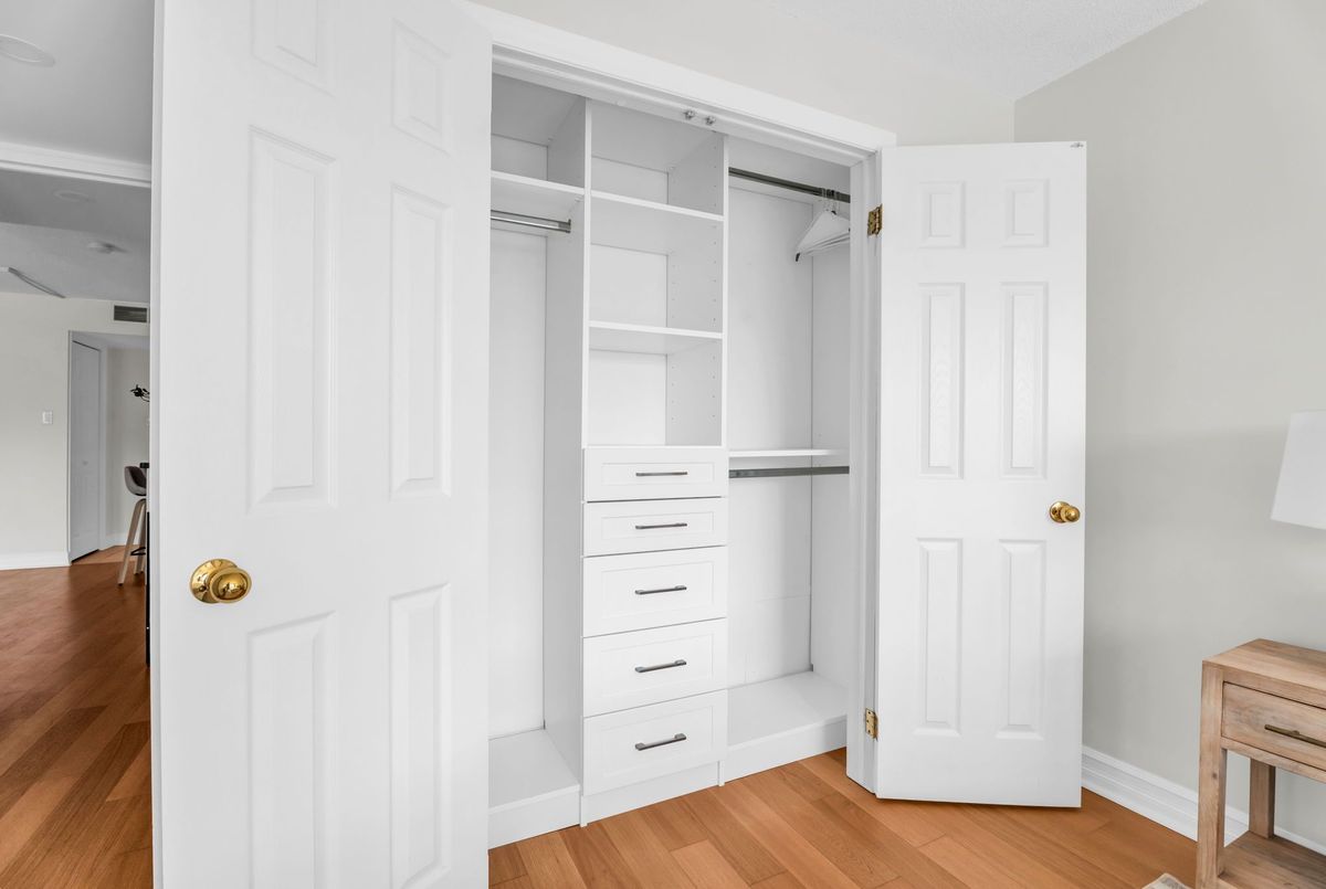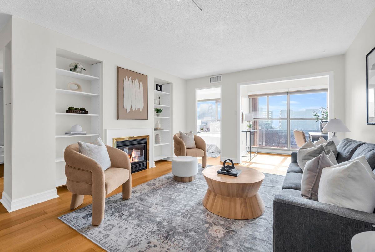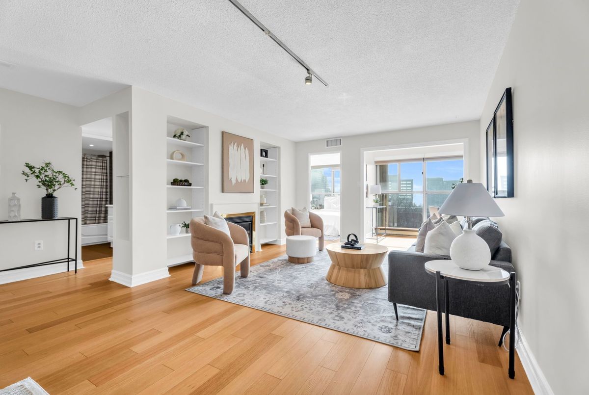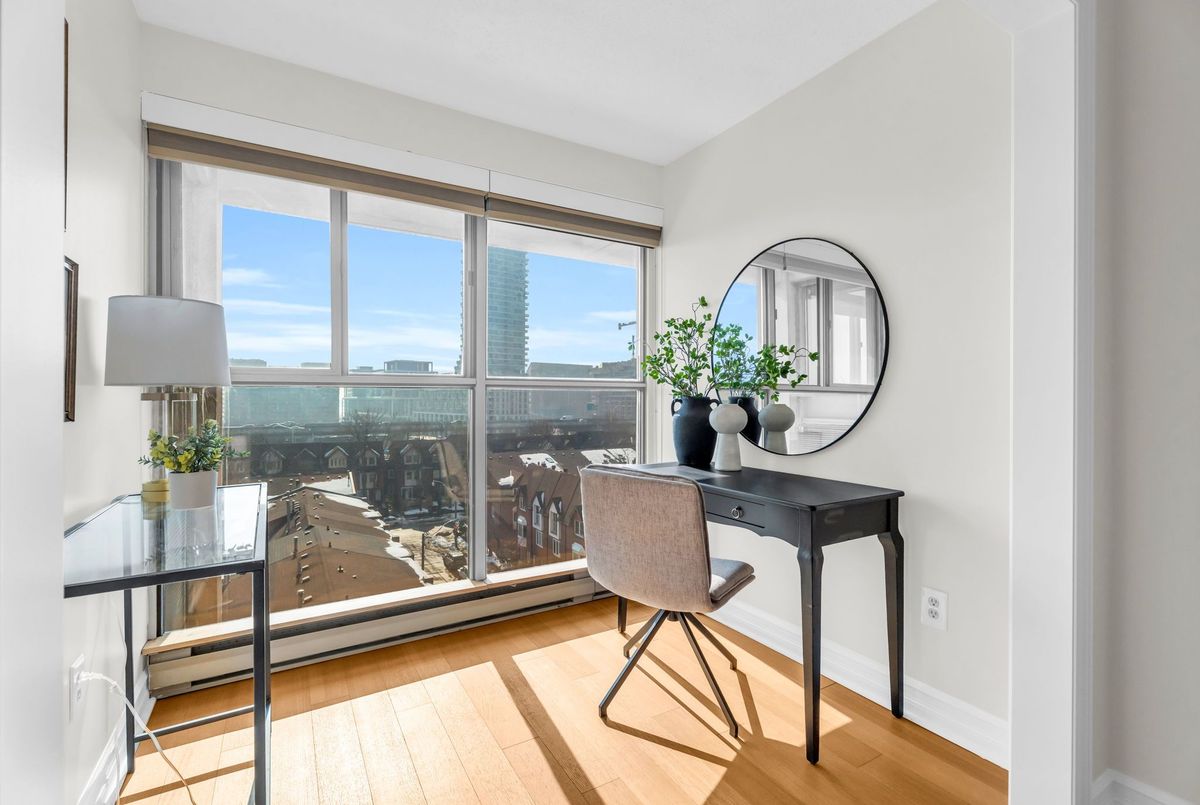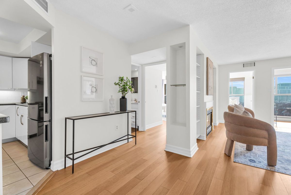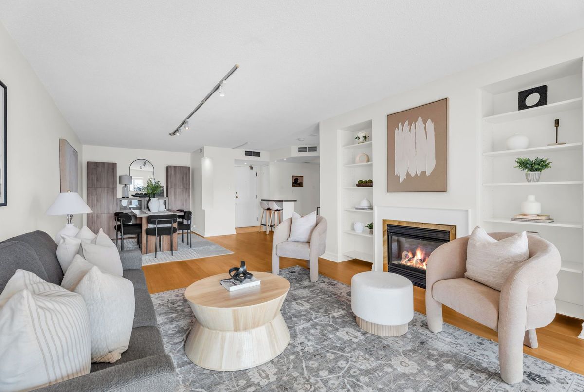 Spacious south-facing suite in Toronto's sought-after waterfront community. This well-proportioned 1,032 sq. ft. suite offers functional living with hardwood flooring throughout, creating a cohesive, timeless feel, a thoughtfully refreshed kitchen finished with stainless steel appliances, and a dedicated dining room - increasingly rare in today's condo layouts. The living room features custom-built-in cabinetry and an electric fireplace that grounds the space, ideal for both everyday living and entertaining. The sun-filled south-facing primary bedroom and den offer lake outlooks, complemented by custom closet organizers, an updated full bathroom, an additional powder room, and convenient in-suite laundry. Includes parking and locker - practical essentials that add everyday ease. Well-managed building with well-considered amenities including an indoor pool, sauna, and on-site car wash. Exceptionally located moments from Sugar Beach, the Distillery District, St. Lawrence Market, theatres, restaurants, shops, TTC access, and the downtown core - offering a rare balance of neighbourhood calm and urban convenience.