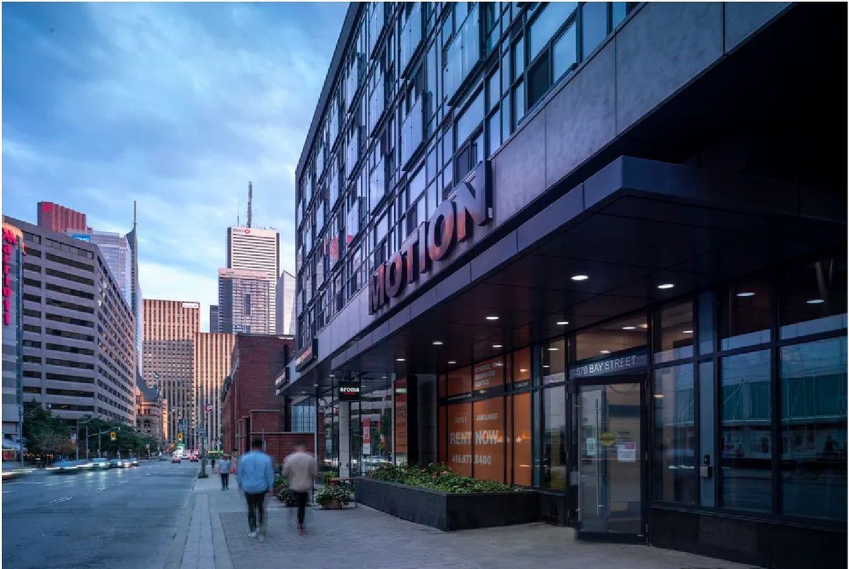 Motion, Offering 2 Months Free Rent W/Move In By June 1. Additional $1,000 Bonus W/Move In By Apr.30. 1 Bedroom Corner Suite With Balcony, Laminate Flooring, Ensuite Laundry, Quality Finishes & Professionally Designed Interiors. Amenities Include Residents Lounge W/Wifi, Gym, Terrace W/BBQ, Bike Parking, Games & Media Rms, Zip Car Availability. Steps From TTC, Eaton Centre, Dundas Square, Financial District, Hospitals, Ryerson & U of T.